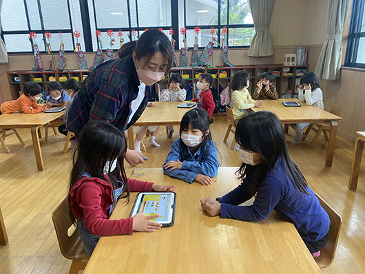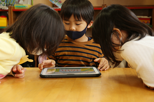 年中・年長児では、タブレットを活用したICT学習とワーク指導を取り入れ、楽しみながら学ぶ時間を設けています。